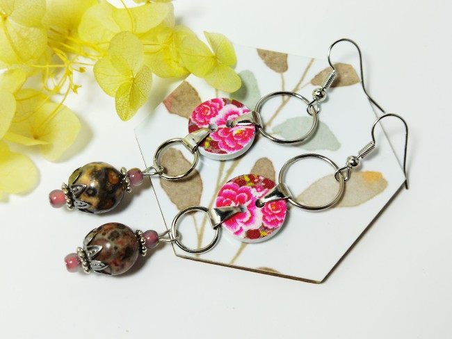 Boucles d'oreilles boutons fantaisie en bois, perles en céramique, décor nature