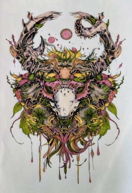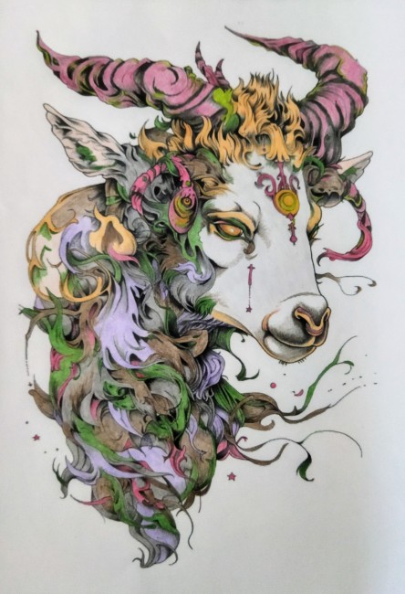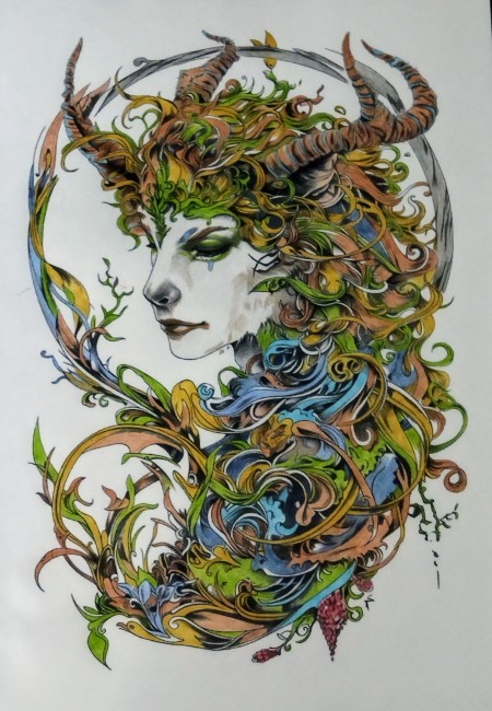 Les créatures prennent vie à travers des visages oniriques, êtres hybrides, divinités imaginaires et figures mystiques, entourés de motifs organiques, floraux ou ornementaux.